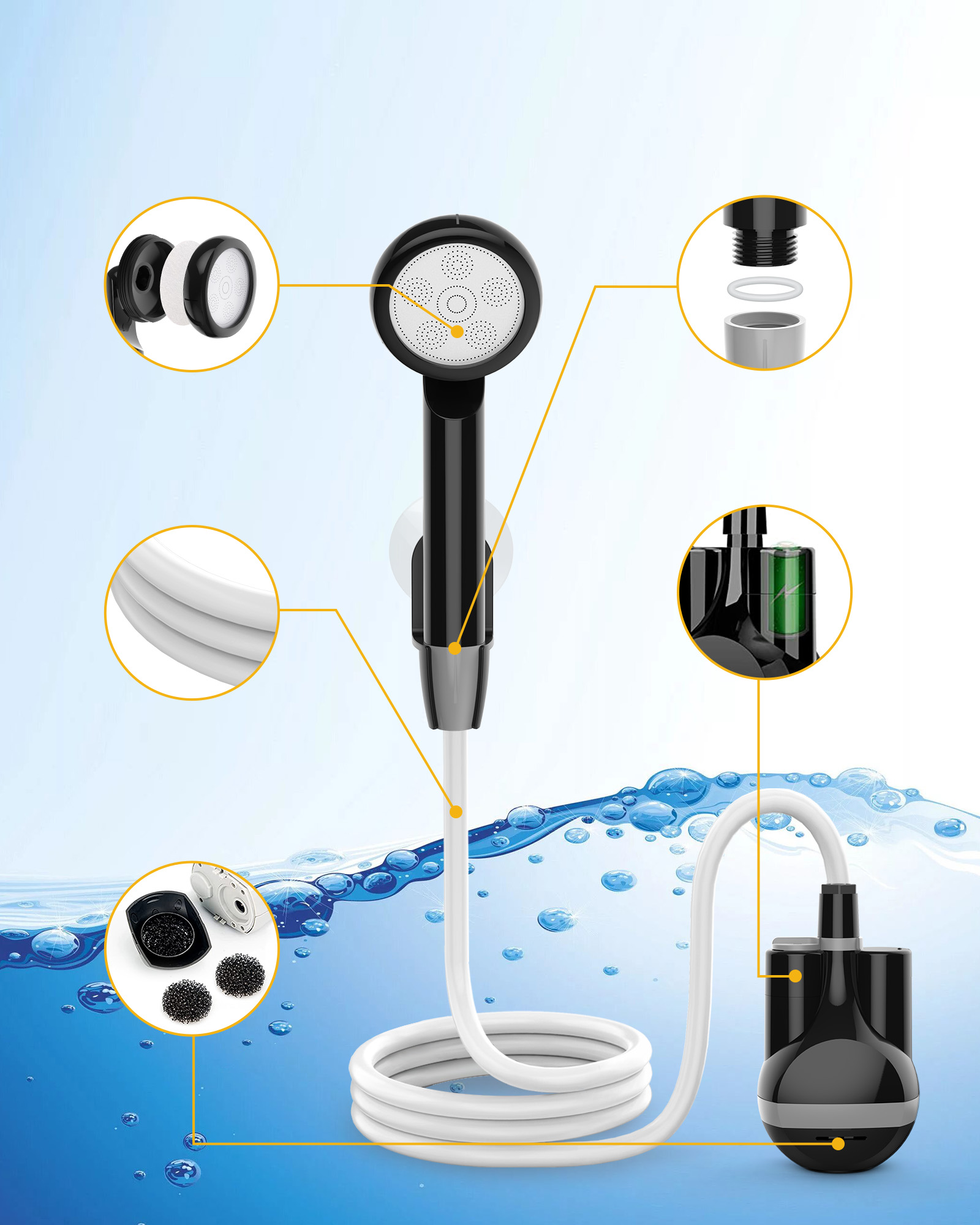 Душ має вбудовану змінну літієву батарею ємністю 2200 мАг, а світлодіод на перемикачі батареї також може вказувати стан зарядки. Для повної зарядки потрібно всього 3-4 години (залежно від характеристик і протоколів зарядки різних зарядних пристроїв). Його можна використовувати безперервно до 45 хвилин, навіть якщо в душі кілька людей. Насолоджуйтесь неперевершеним душем на відкритому повітрі.