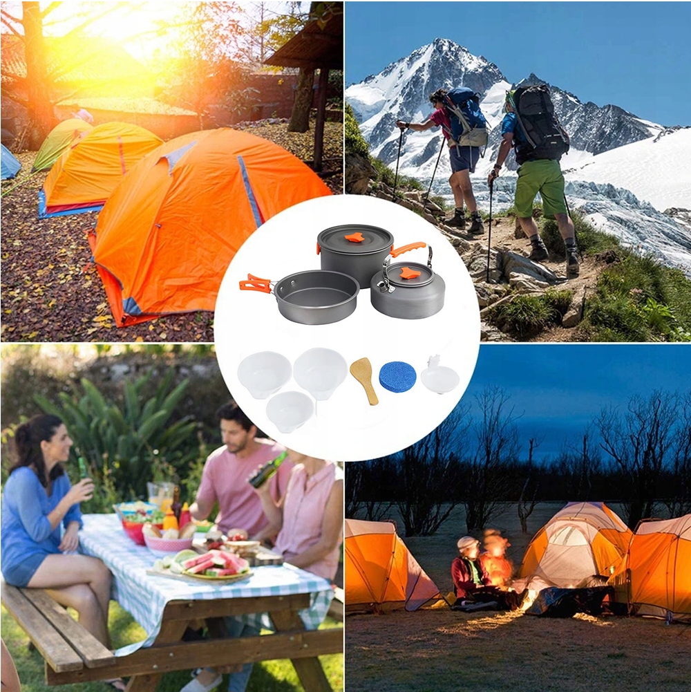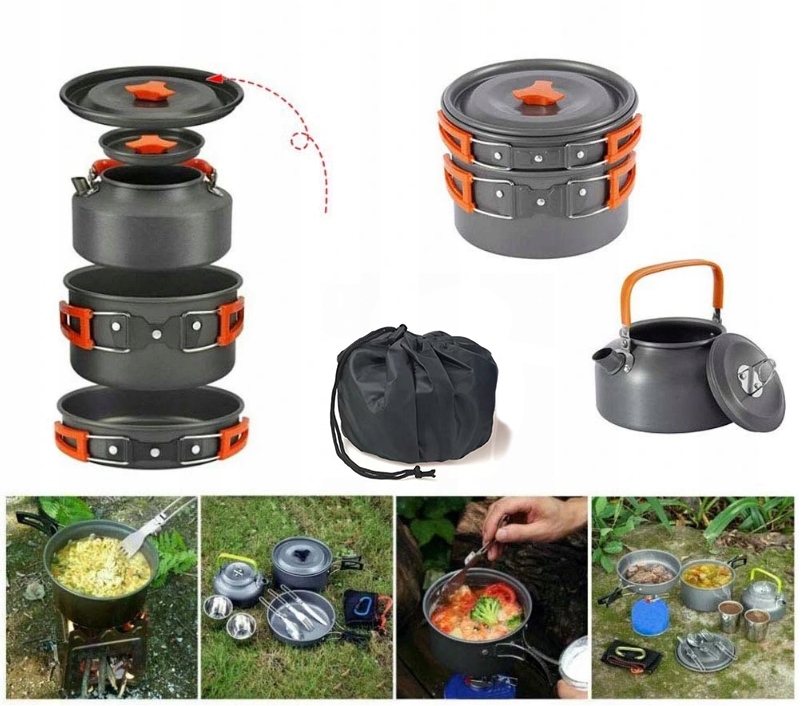 - Наш набір включає 10 основних елементів, необхідних кожному туристу: каструля, сковорода, чайник, кришка, засіб для чищення, дерев’яна ложка, пластиковий складаний ківш і 3 пластикові миски для їжі.