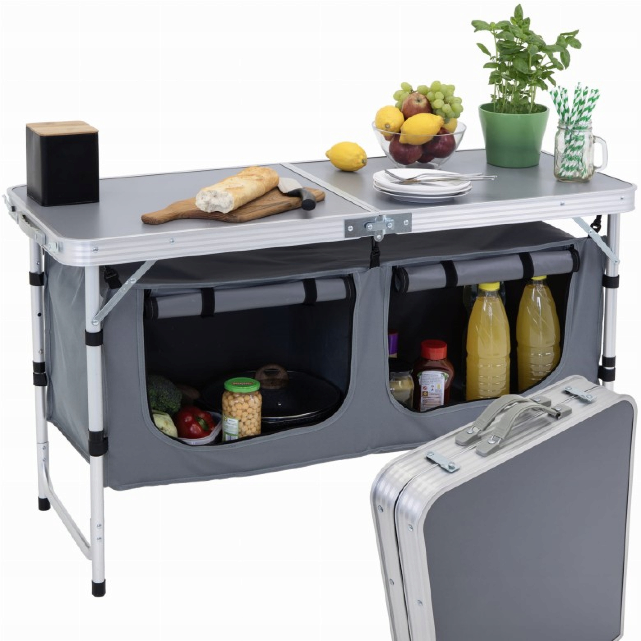 Основним елементом є таблиця, який можна встановити на трьох різних висотах, адаптуючи його до різних потреб: приготування страв, стоячи, сидіння їжею або використовуючи як низький стіл. Додатковою перевагою є підвісна шафа з двома камерами та загартованими поличками, які дозволяють зберігати їжу, страви та інші необхідні аксесуари. Вся кухня розроблена так, щоб її можна було скласти в зручну валізу. Завдяки якому легко транспортувати та зберігання, особливо поза сезоном.