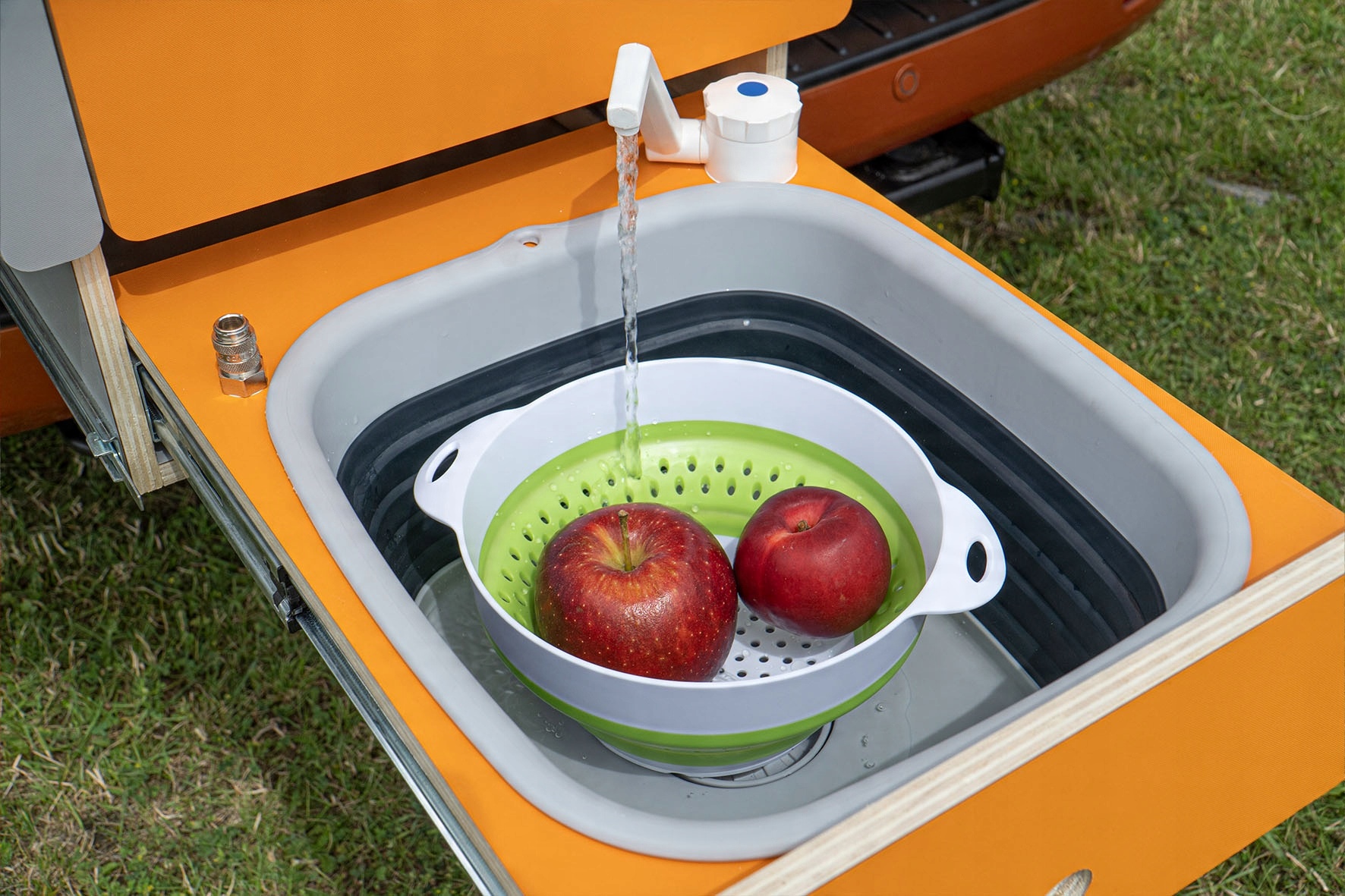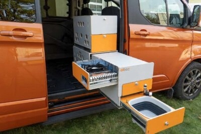 У верхньому ящику знаходиться газова плита. Зовсім поруч розташована зручна стільниця. У нижній шухляді розкладна силіконова раковина, кран з подачею води та швидкісний роз’єм для зовнішнього душа. Цей модуль також оснащений резервуаром для води та електричним насосом. Система живиться від гнізда прикурювача автомобіля. У середній шухляді знаходиться органайзер для столових приборів і кухонного начиння. Основні напрямні модуля оснащені системою lock-in lock-out - яка дозволяє фіксувати модуль як в складеному, так і в розкладеному положенні.