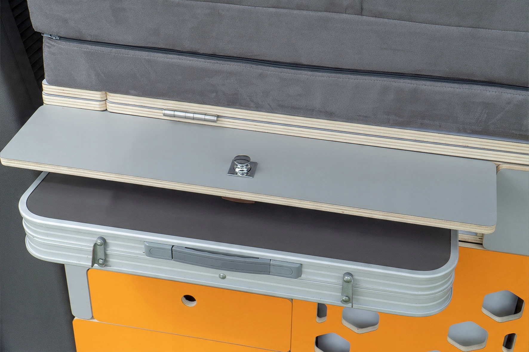 Це все, що вам потрібно, щоб насолоджуватися приготуванням їжі в будь-який час подорожі. Завдяки системі направляючих компактний модуль у розкладеному вигляді перетворюється на функціональну кухню розміром 100x65 см!