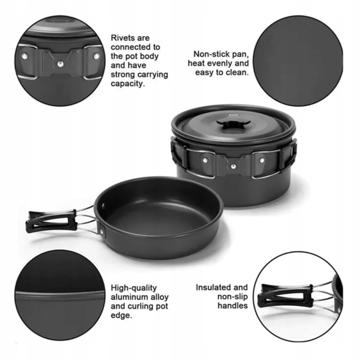 ІДЕАЛЬНО ДЛЯ ЕКСПЕДИЦІЙ – набір туристичних горщиків ідеально підходить для походів, туристичних походів, кемпінгу та інших видів діяльності. Портативна пластикова ручка має гарне захоплення та функцію захисту від опіків, що робить її більш зручною у використанні.