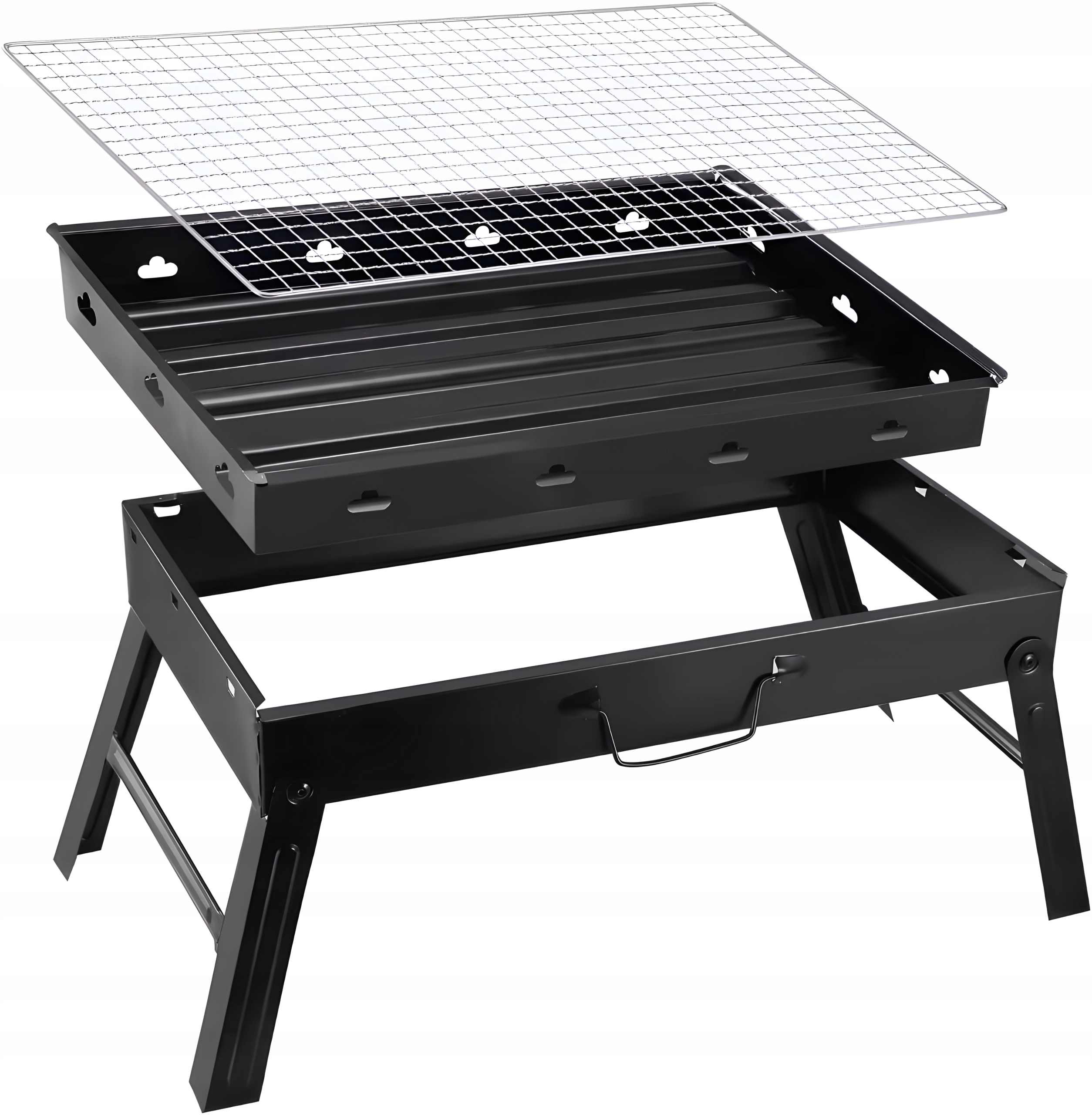 Зібрати гриль дуже легко. Просто розкладіть ніжки,розмістіть камін і піднос, b>, а потім помістіть решітку на гриль, і готово! Він також можна повторно скласти.Він також оснащений ручкою, яка полегшує перенесення.