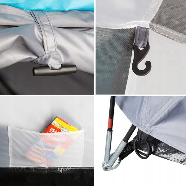 Структура намету - три кадри, виготовлені зі склопластику, які встановлюються в тропіках. Тунелі та рами позначені тим самим кольором, тому ви можете легко відрегулювати відповідний кадр до тунелю. Завдяки спеціальним ручальникам всередині тропіків ми прикріпимо незалежну спальню. Весь намет і стрижні, які кріплять тропіки, встановлюються на високих підборах.