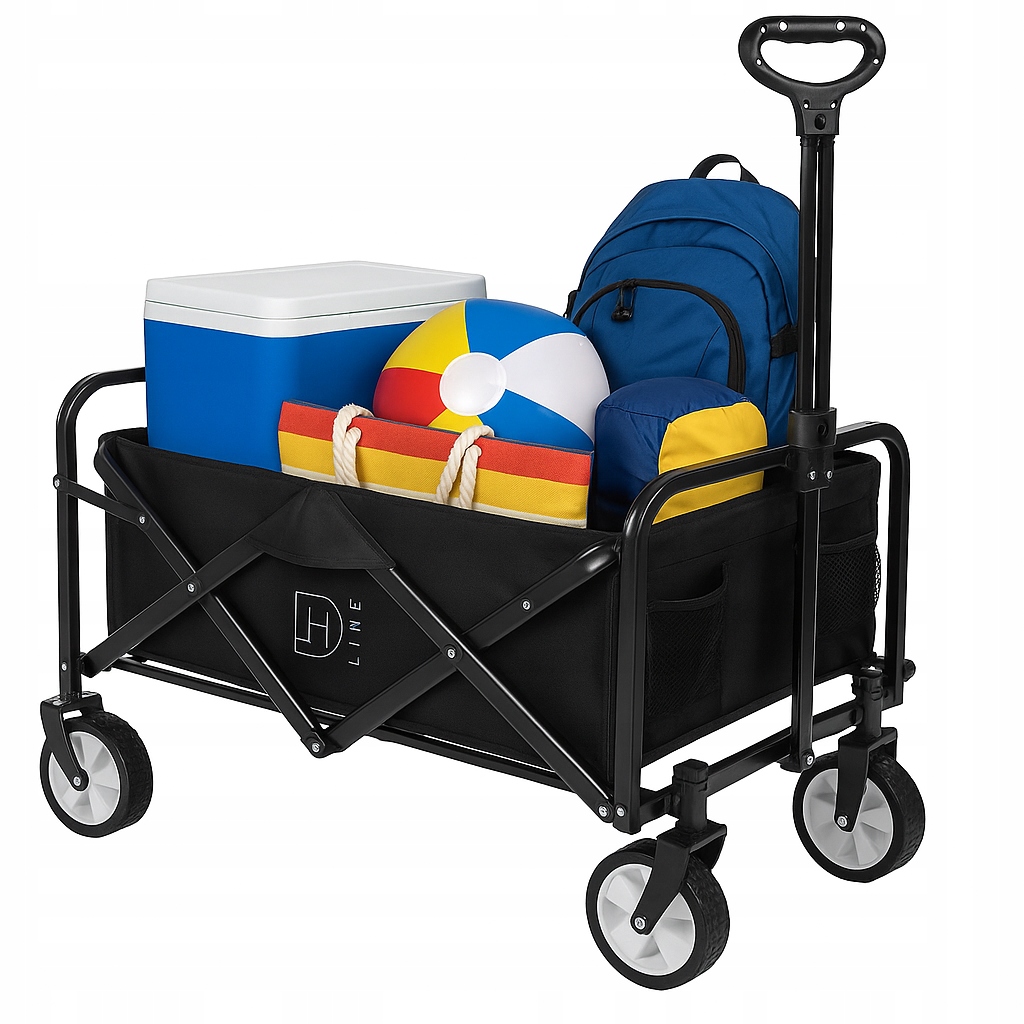 Завдяки сталевій конструкції , міцній тканині Oxford 600d та завантаження до 150 л , ви легко перевозять усе, що потрібно - від покупок пляжних аксесуарів, для садових інструментів. Можна використовувати як візок для перевезення дитини!