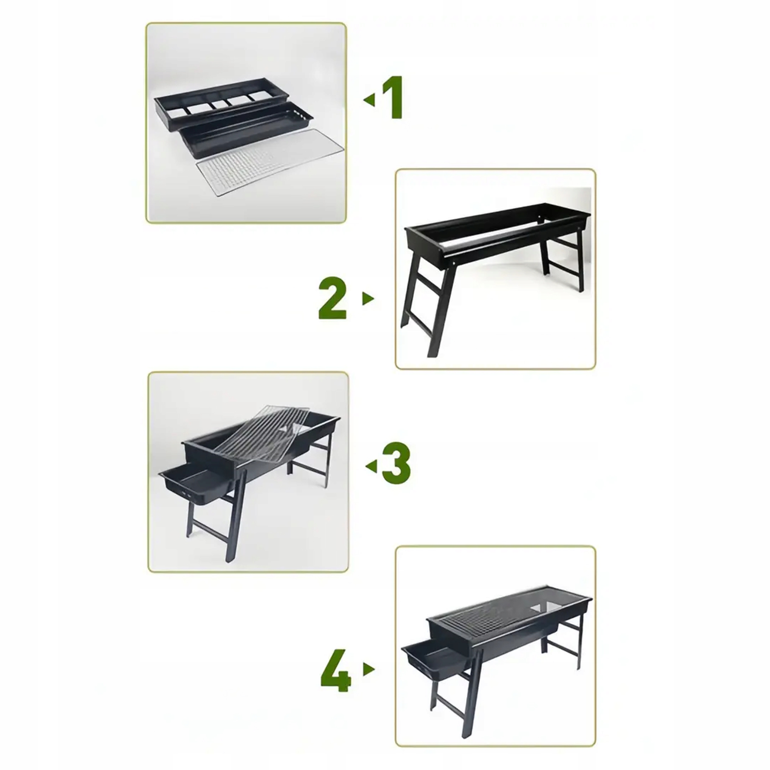 Переносний туристичний грильз чорної сталі з порошковим покриттям. Оснащений нижньою решіткою з піддоном для вугілля та складними ніжками.