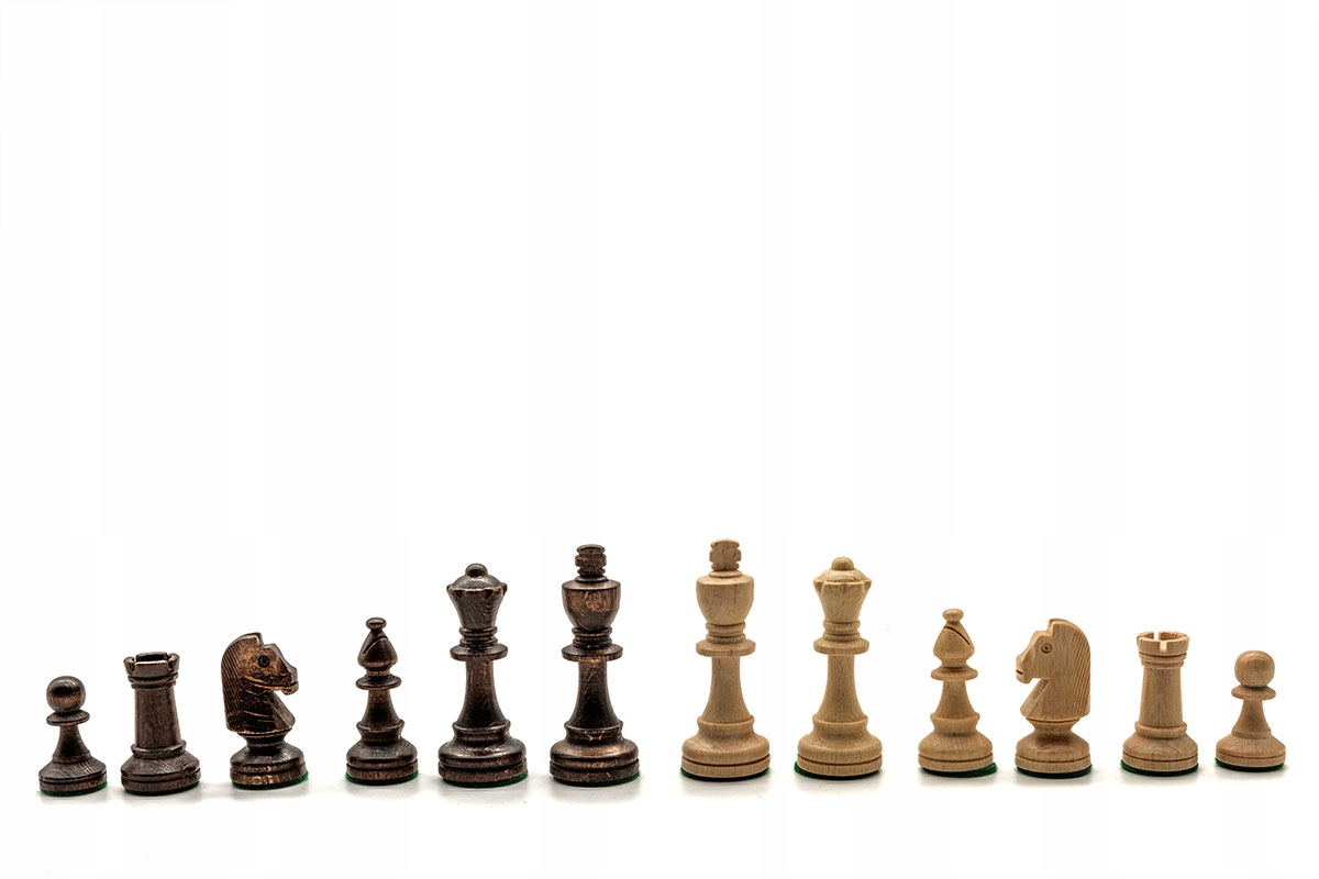 Шахові фігури виготовлені з дерева з доданими вручну деталями (наприклад, лицарська грива), висота короля приблизно 85 мм.