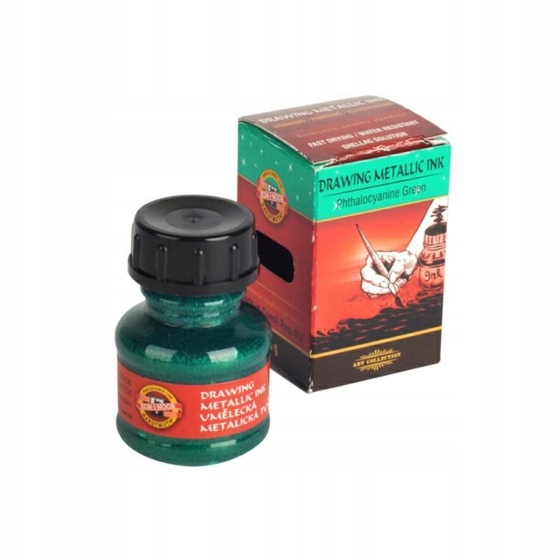 KOH-I-NOOR ЧОРНИЛО ДЛЯ МАЛЮВАННЯ МЕТАЛІК ЗЕЛЕНИЙ 2510 Вони характеризуються стійким і яскравим кольором, стійкі до світла, дуже добре і довго поєднуються з основою. Після висихання чорнило створює міцне водонепроникне покриття. Чудово працює на кальці, папері та картоні.