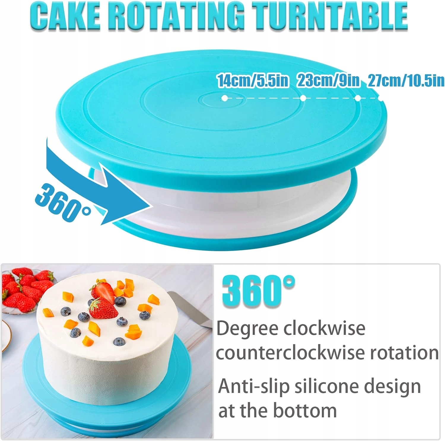 - 【Поворотна тарілка для торта】 Поворотна ручка м’яка та надійна з прихованими шарикопідшипниками, її можна повертати на 360 градусів за або проти годинникової стрілки. Коли ви зайняті формуванням торта, гума на нижній частині поворотного столика забезпечує міцне зчеплення, тому вам не доведеться турбуватися про те, що ви посковзнетеся чи впадете.