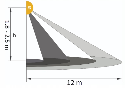 З урахуванням параметра висоти (h). Коли чутливість встановлена на максимальне положення, датчик може виявляти рух на ділянці до 12 м. Діапазон чутливості можна додатково зменшити в налаштуваннях у додатку.