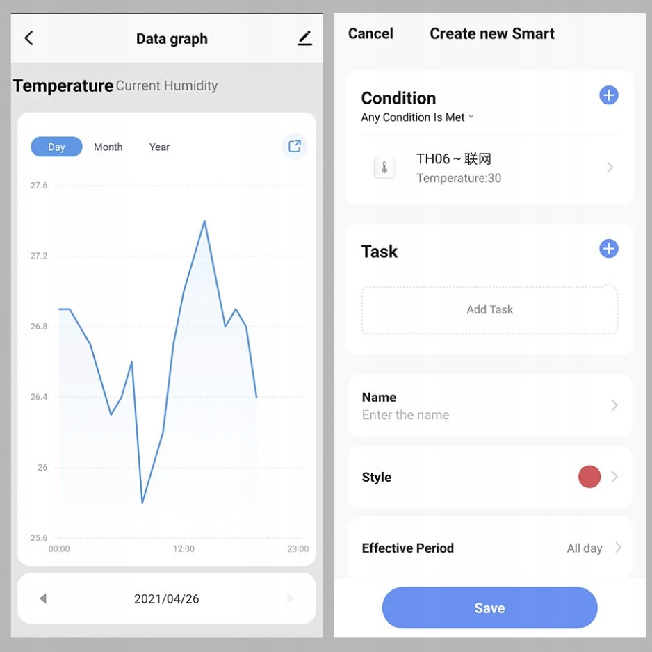 Висока точність і моніторинг у реальному часі допомагають реалізувати різноманітні стратегії з’єднання. Наприклад, якщо температура сягне 32,6 градусів за Цельсієм, увімкніть кондиціонер за допомогою нашого універсального пульта. Або вмикайте зволожувач повітря, коли вологість стає нижчою за певне значення.