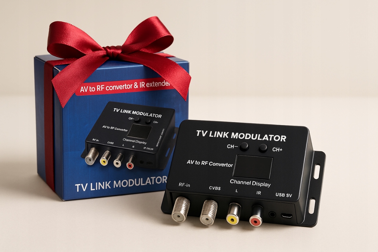 TV Link Modulator — це сучасний перетворювач аудіо/відео в радіочастоту з функцією розширювача ІЧ-сигналу, що дозволяє передавати аудіо-відеосигнал із декодера, DVD або DVR на кілька телевізорів одночасно через коаксіальний кабель. Це також дозволяє віддалено керувати джерелом сигналу з іншої кімнати.