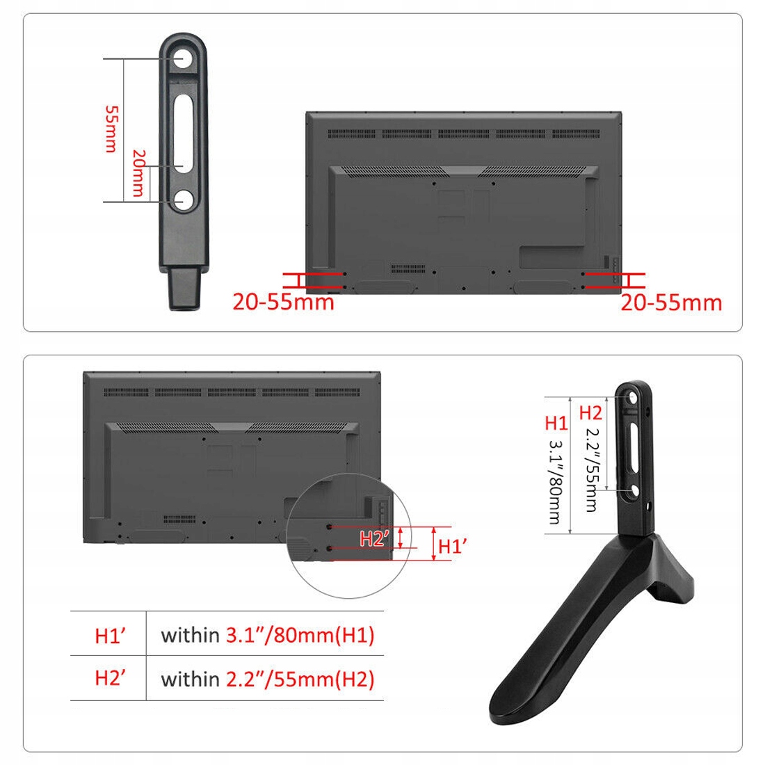 Ця підставка для телевізора не підходить для всіх телевізорів. Відстань між верхнім отвором і нижнім краєм становить 7,5 см, а відстань між верхнім і нижнім отворами - 5,5 см. Купуючи підставку, перевірте, чи розташовані задні кріпильні отвори внизу телевізора, і виміряйте відстань між отворами. Кронштейн можна використовувати з монтажними отворами під телевізором на відстані 20-55 мм/0,78-2,16 дюйма.