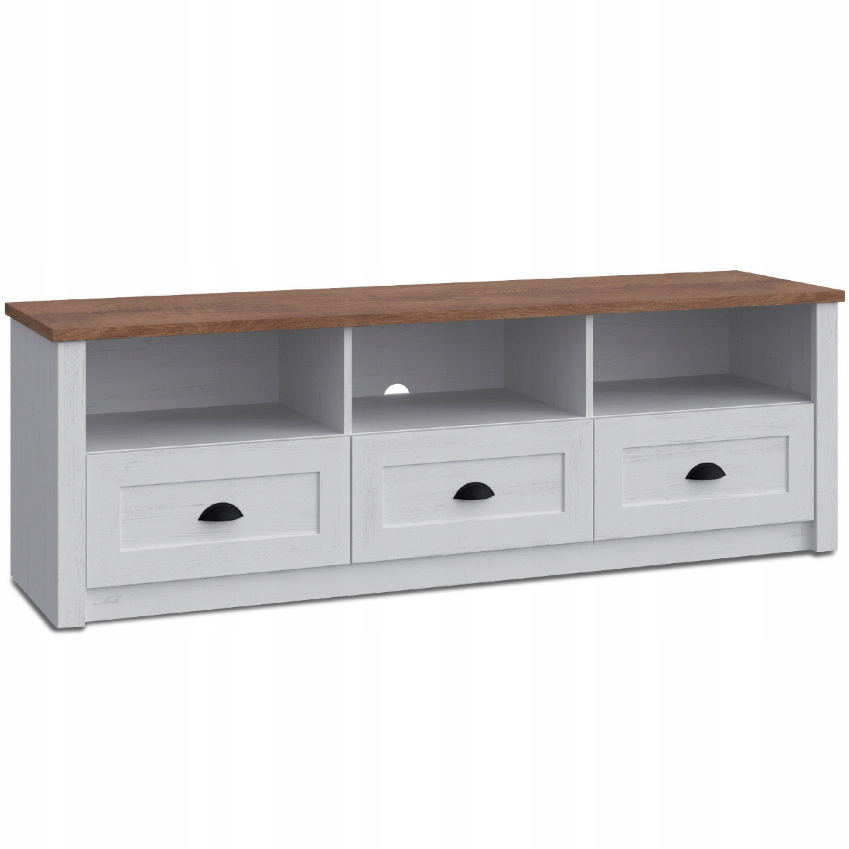 Класична телевізійна шафа LEMAS у провансальському стилі – ідеальна пропозиція для людей, які цінують меблі найвищої якості. Ламінат білого та темного дуба та стилізовані ручки підкреслюють його провансальський дизайн. Предмет меблів стане ідеальною основою для телевізора або аудіотехніки, а отже, стане одним з найважливіших елементів обладнання кімнати. Шафа оснащена трьома висувними ящиками, в яких можна зберігати різні предмети, які не хочеться демонструвати. Відкриті полиці можна використовувати для консолей, ігор і DVD.