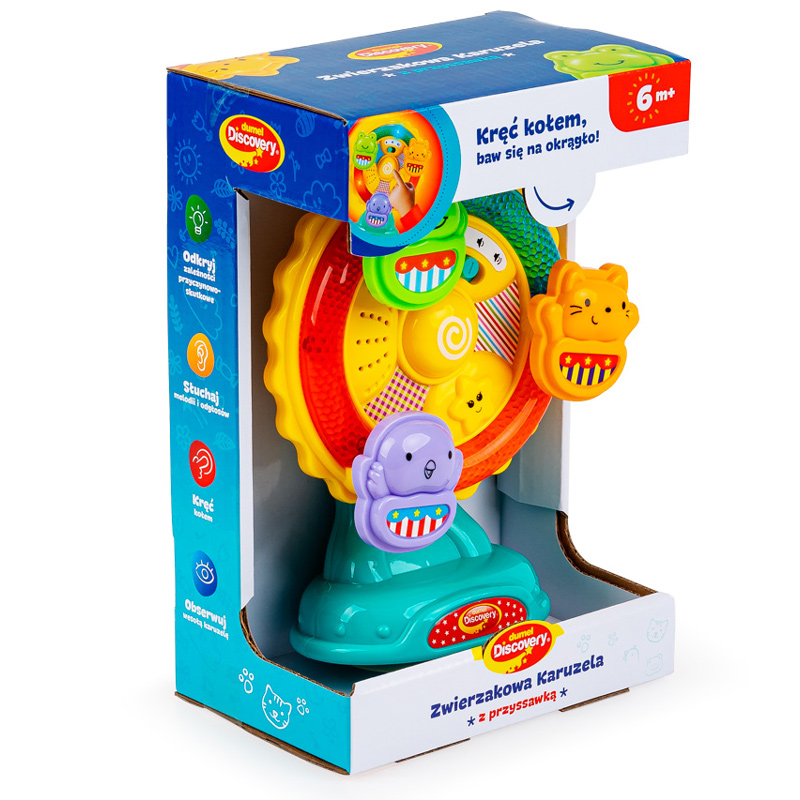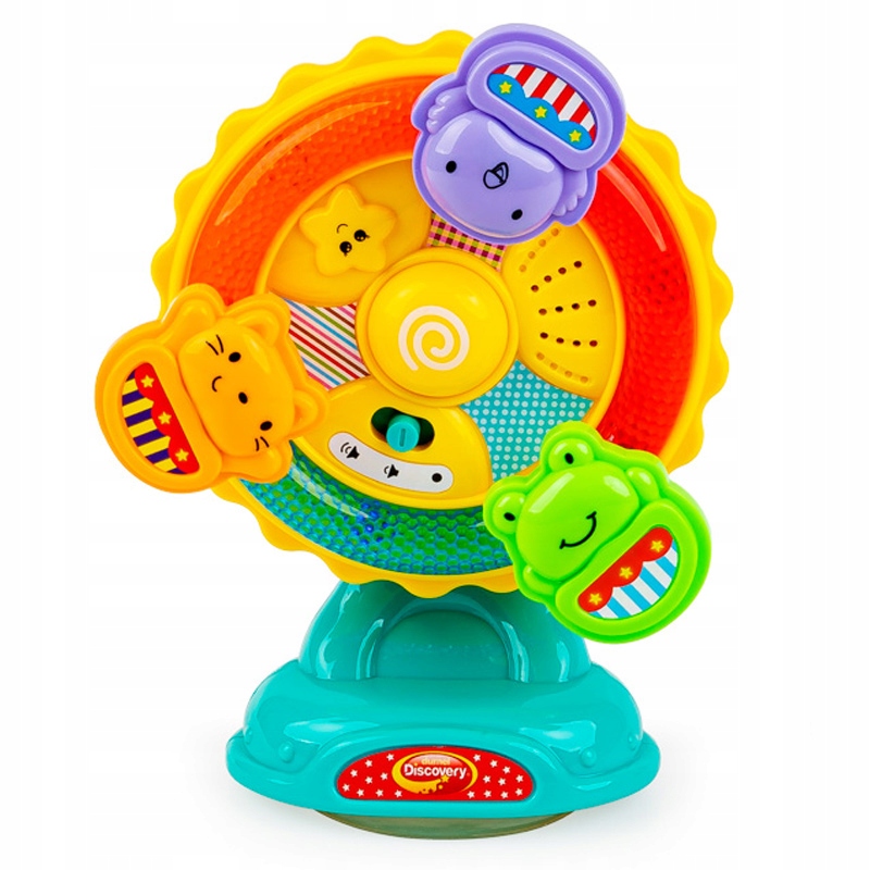 Крути колесо каруселі та приєднуйся до веселощів! Мобіль має звуки тварин, мелодії та мигаючі вогники, а завдяки практичній присосці його можна прикріпити до рівної, чистої та гладкої поверхні, щоб він не рухався під час гри. Натиснувши кожну тваринку, малюк почує її звук і мелодію. Функція регулювання гучності дозволяє налаштувати іграшку під ваші індивідуальні потреби. Продукт призначений для дітейвід 6 місяців.
