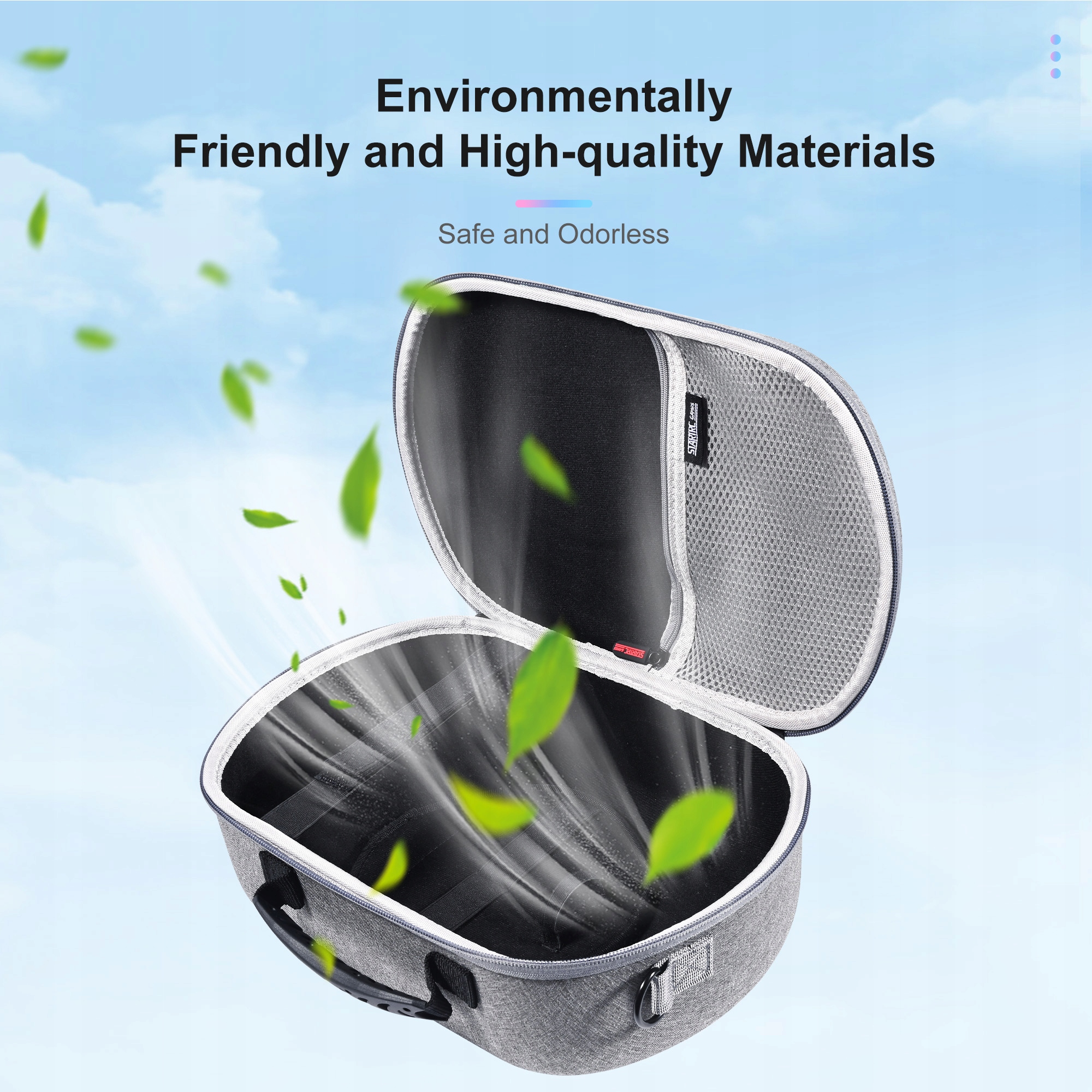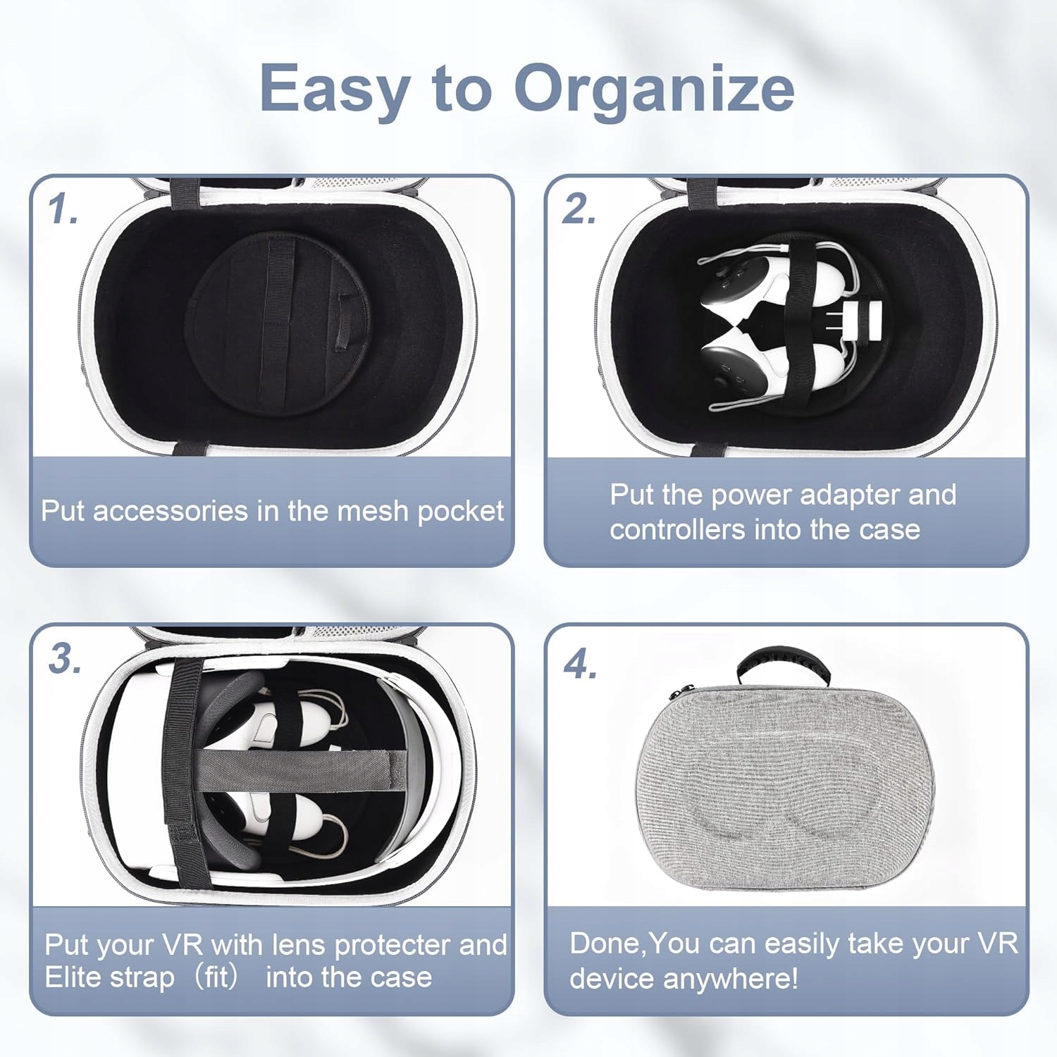 Мала форма та великий простір: чохол невеликий, його легко носити подорожі, багато місця всередині корпусу. Ви можете розмістити сенсорні контролери, кабель для заряджання, джерело живлення та блок живлення, елітний ремінець (Fit Part of Head Straps сторонніх виробників).