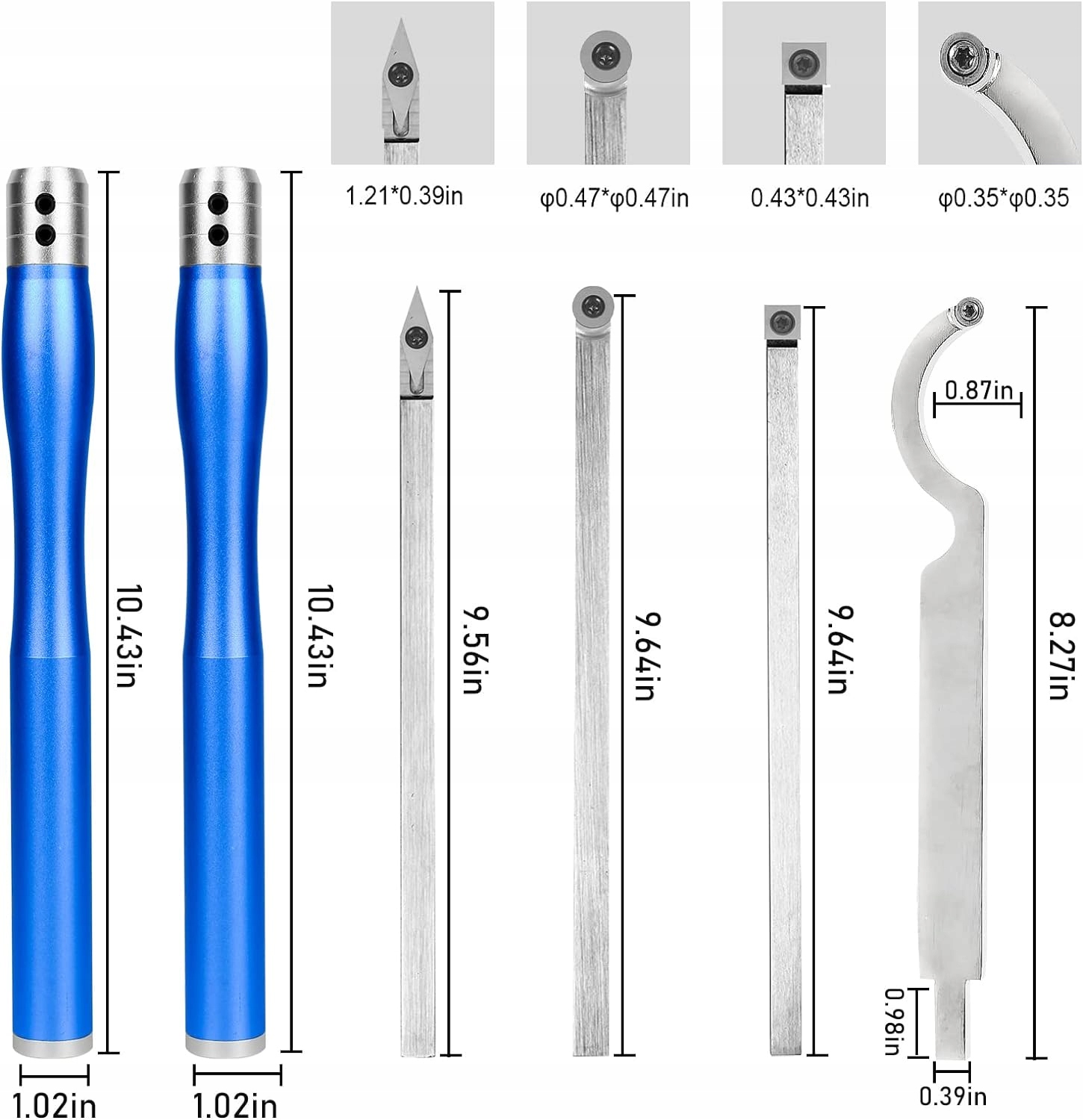 Пакет включає: 1 x інструмент для чорнової обробки, 1 x інструмент для чистової обробки, 1 x інструмент для скоби , 1 x порожнистий інструмент «гусяча шия», 11-дюймові ручки, 1 x з’єднувач для рукоятки з алюмінієвого сплаву, 2 x гайкові ключі T15, 4 x змінні насадки та все в коробці дисплея p>