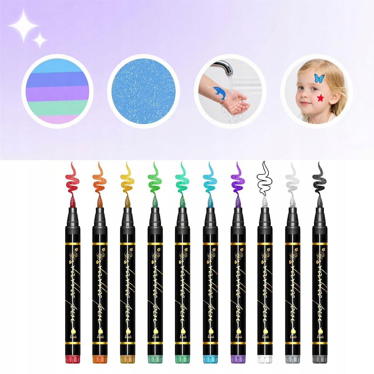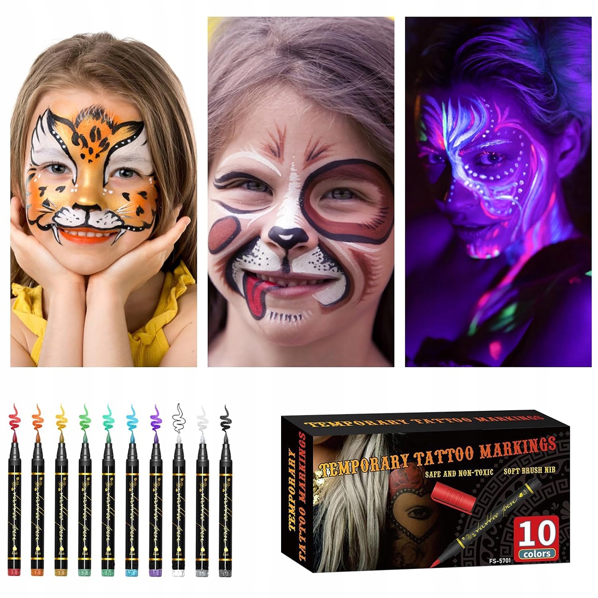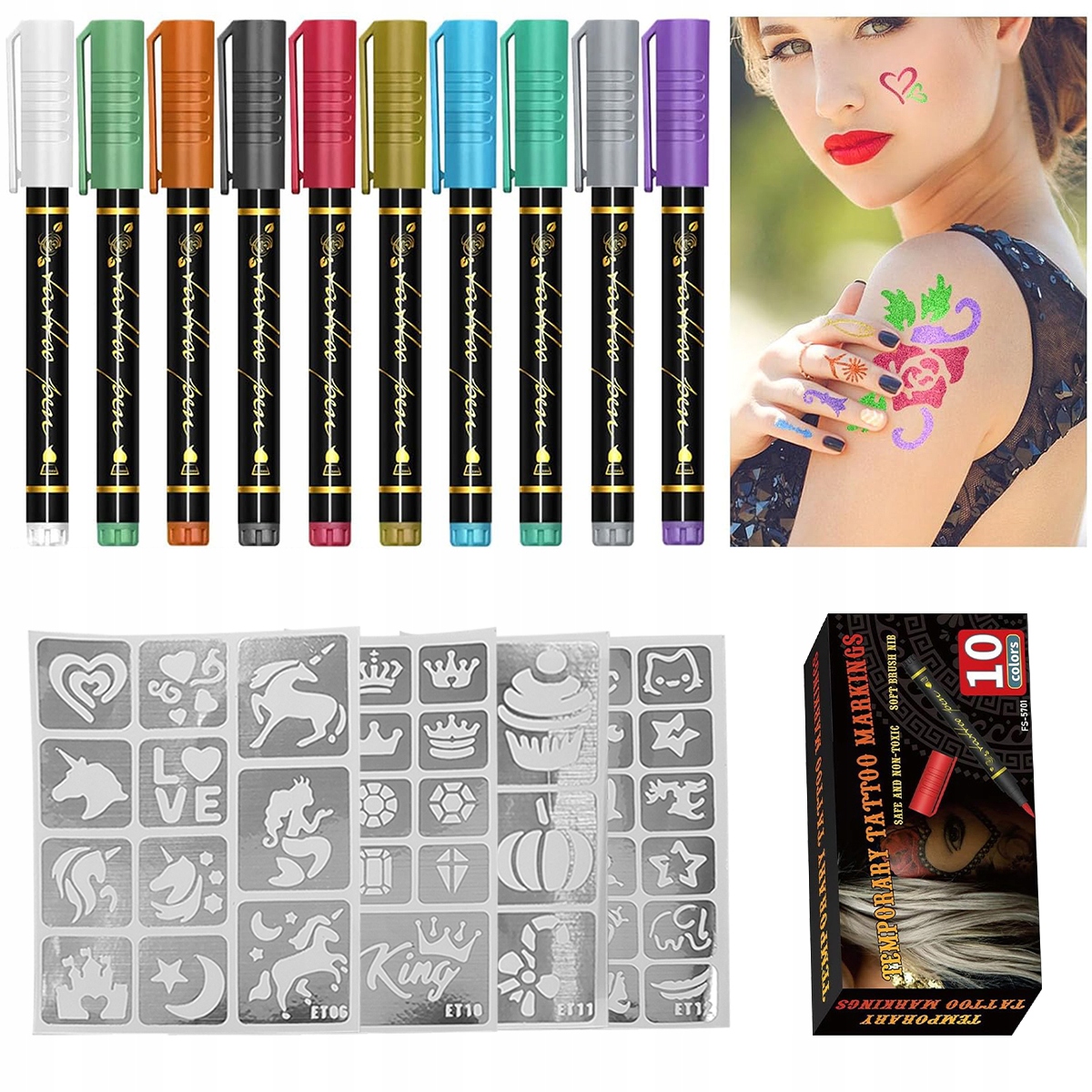 Набір дитячих блискучих маркерів для татуювань включає 10 яскравих кольорів: рожевий, помаранчевий, фіолетовий, синій, зелений, зелений, сріблястий, білий, сірий і золотий + 4 аркуші трафаретів для тимчасових татуювань (66 трафаретів). Щоб надихнути дітей і дати волю їхній уяві. Ідеально підходить для створення креативних тимчасових татуювань на шкірі та інших поверхнях.