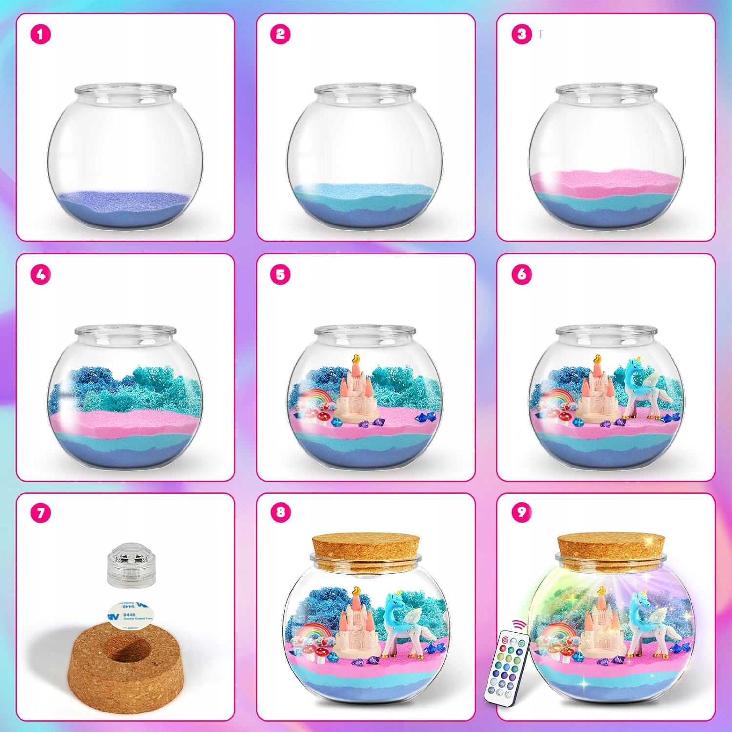 🦄🦄 🦄🦄 🦄🦄 🦄🦄 🦄🦄 🦄🦄 🦄🦄 🦄🦄 eu terrarium set: Цей художній набір єдинорога для дітей містить магічний пісок, збережений мох, 13-кольорову світлодіодну нічну лампу з віддаленим контролем, мініатюрами єдинорогів, мініатюрами грибів, мініатюрами замків та декоративних аксесуарів. Чарівний художній та ремісничий проект для дітей.