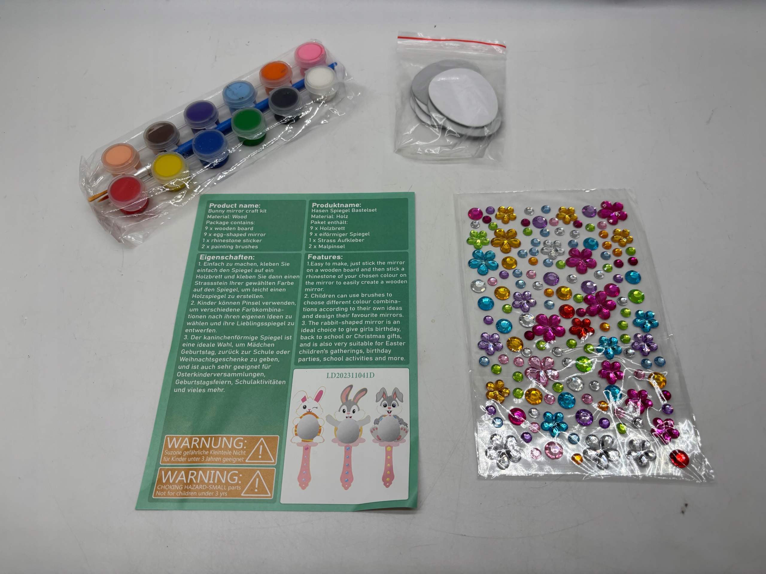 - DIY SET з мотивом великоднього зайчика: наш DIY -набір містить 9 дерев’яних великодніх гріхів, 9 яєць -міркерів, 1 наклейки з квіти. Набір завершений і може створити прекрасні великодні дзеркала. 4 Дзеркало було лазерним і відшліфованим, з гладкою і чистою поверхнею, без бруду та зади, без запаху, безпечним у використанні і не шкодить рук.