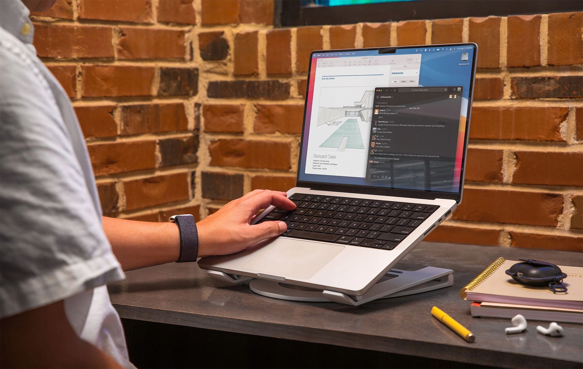 Користуючись MacBook у кафе, розташуйте його ближче до прилавка та відрегулюйте кут клавіатури від 0 до 45 градусів. Знову в офісі? Підніміть Curve Flex якомога більше, щоб камера ноутбука була у вашій видимості, а його екран знаходився на висоті зовнішнього монітора, напр. 27-дюймовий дисплей Apple Studio. Завдяки цьому ви можете зручно проводити відеодзвінки та використовувати двоекранну конфігурацію.