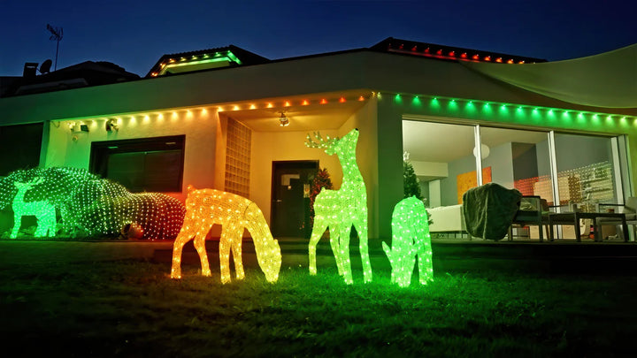 Розкажіть історію різдвяної магії за допомогою світлодіодних фігурок Twinkly Reindeer, керованих програмою. елегантний, тривимірний дизайн, що привертає увагу, стимулює уяву та доповнює приголомшливий зовнішній дисплей із індивідуальною яскравою анімацією у понад 16 мільйонах кольорів.
