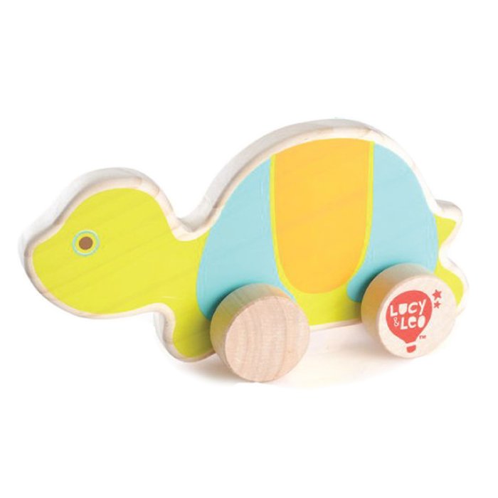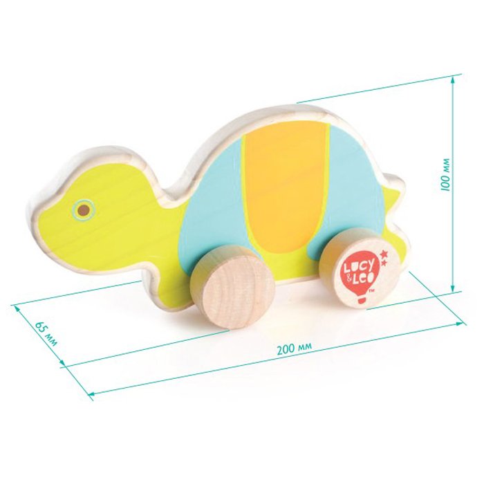 Черепаха на колесах з дерева красивих кольорів, які привертають увагу дитини. Колеса легко обертаються, що забезпечує плавне катання по різних поверхнях, ергономічна форма іграшки забезпечує надійне утримання в крихітній ручці дитини.