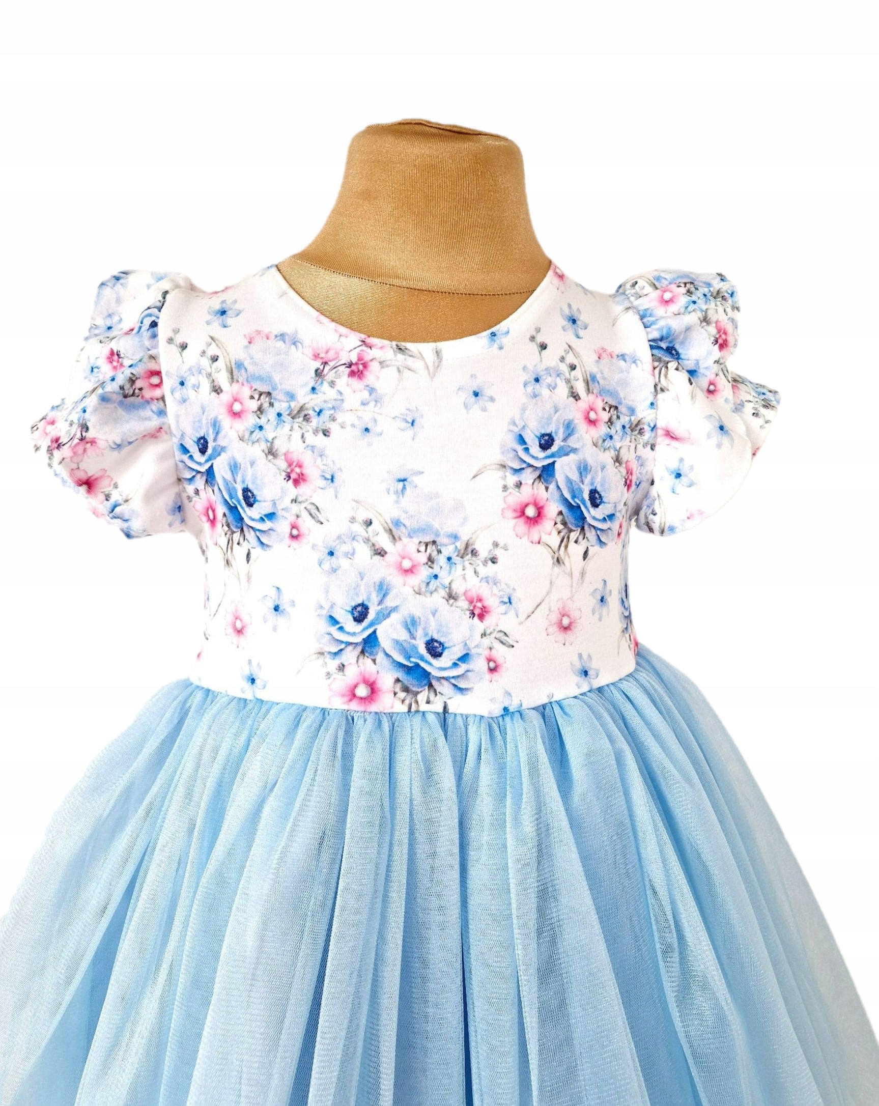 Верх з красивими квіточками пастельних тонів і низ з синього фатину.