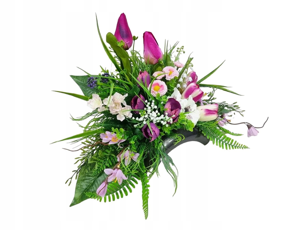 Невеликий, але з великою кількістю квітів та аксесуарів весняний цвинтарний набір. Центральний елемент у важкій чорній ікебані. Квіти виглядають чудово. Вони виглядають живими.