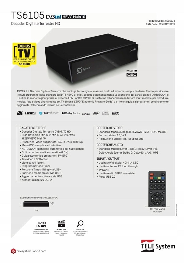 TS6105 — це декодер цифрового ефірного телебачення, який поєднує в собі найвищий рівень технологій і виняткову простоту використання. Готовий приймати майбутні програми в 10-бітному стандарті DVB-T2 HEVC, він автоматично сканує цифрові канали (AUTOSCAN) і сортує їх «логічно» завдяки системі LCN. Більше того, TS6105 можна перетворити на медіаплеєр, якщо потрібно відтворювати музику, фотографії та відео безпосередньо на домашньому телевізорі. Електронний довідник програм EPG пропонує безперервно оновлюваний довідник програм. Пульт дистанційного керування включено.
