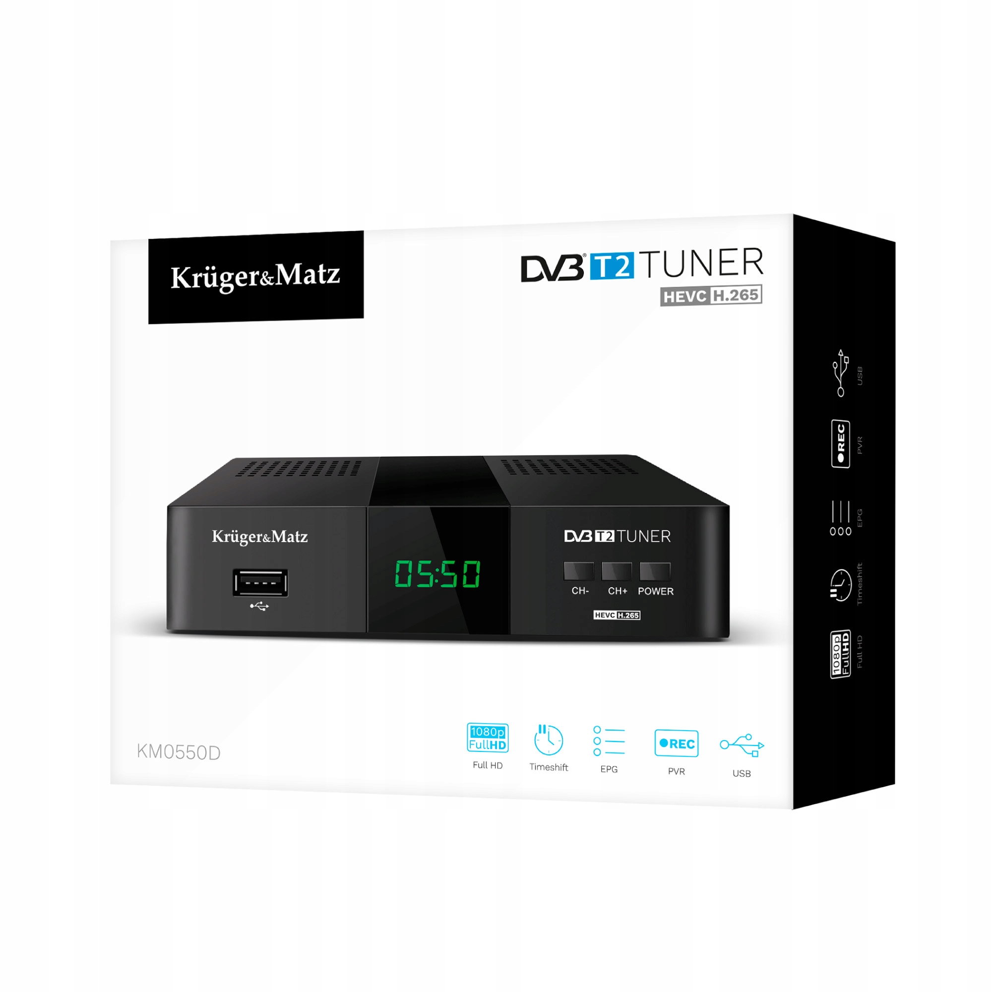 Більше того, тюнер Kruger&Matz dvb t підтримує багато форматів, зокрема: H.265 HEVC, що гарантує правильну роботу після змін стандарту кодування.