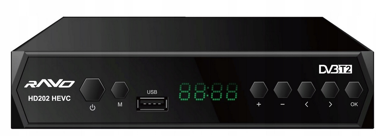 DVB-T2 RAVO HD202 digital ефірний телевізійний тюнер HEVC дозволяє приймати безкоштовні цифрові телеканали, що транслюються в стандарті H.265/HEVC. Його також можна використовувати як високоякісний медіаплеєр і PVR-рекордер.