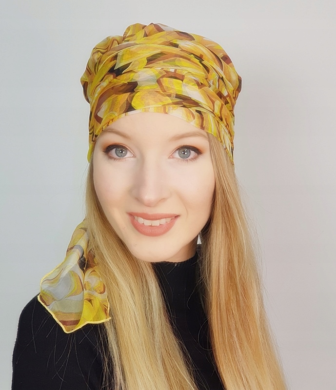 Шарф оброблений підкладкою, що створює ефект повнішої голови, матеріал не прилипає до голови.