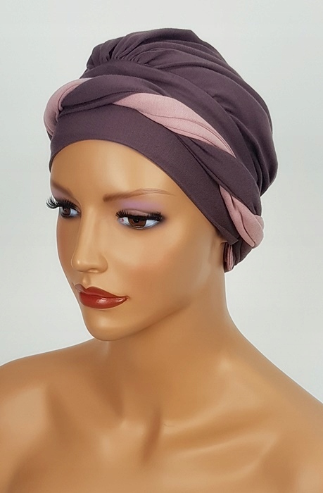 Тюрбан Sejla x-1 відтінку какао/баклажана з одним рожевим поясом