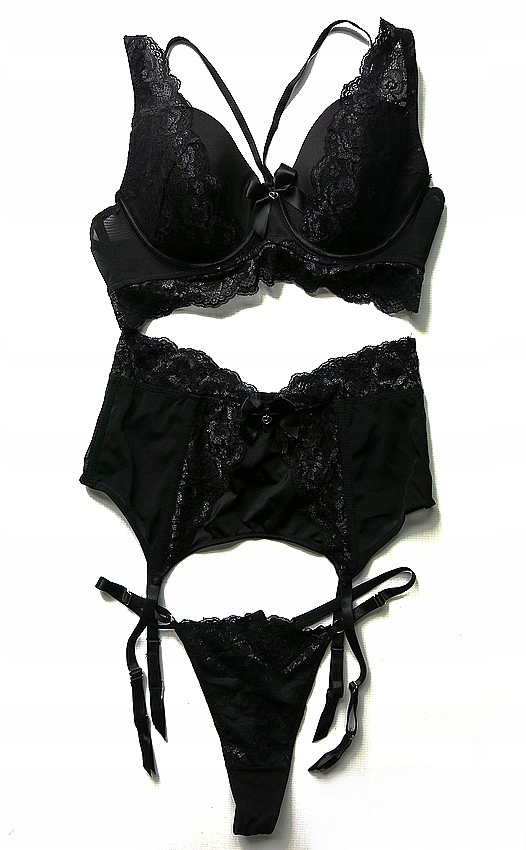 - Чорний бюстгальтер, оздоблений мереживом. Застібається на гачки. М'яка чашка, на кісточках. Має регульовані бретелі.