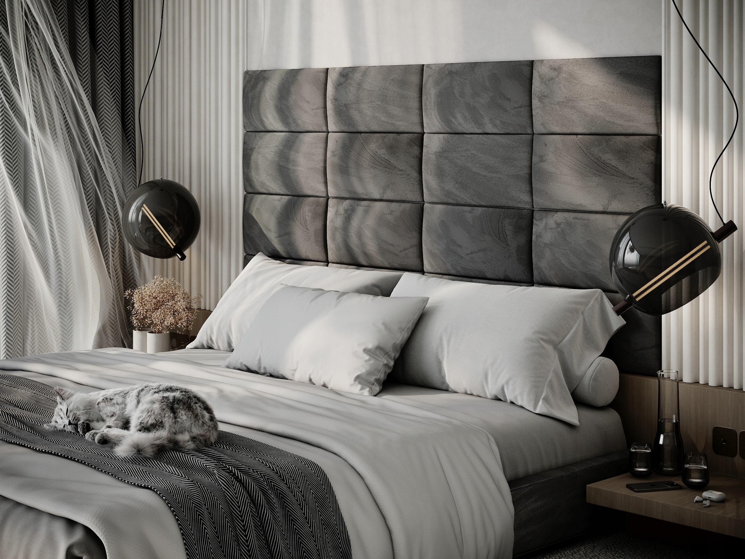 Ці панелі, як правило, прикріплені до стін або стелі, мають щільну товсту оксамитову тканину для краще звукопоглинання та пропонується в широкому діапазоні кольорів, щоб доповнити декор кімнати.