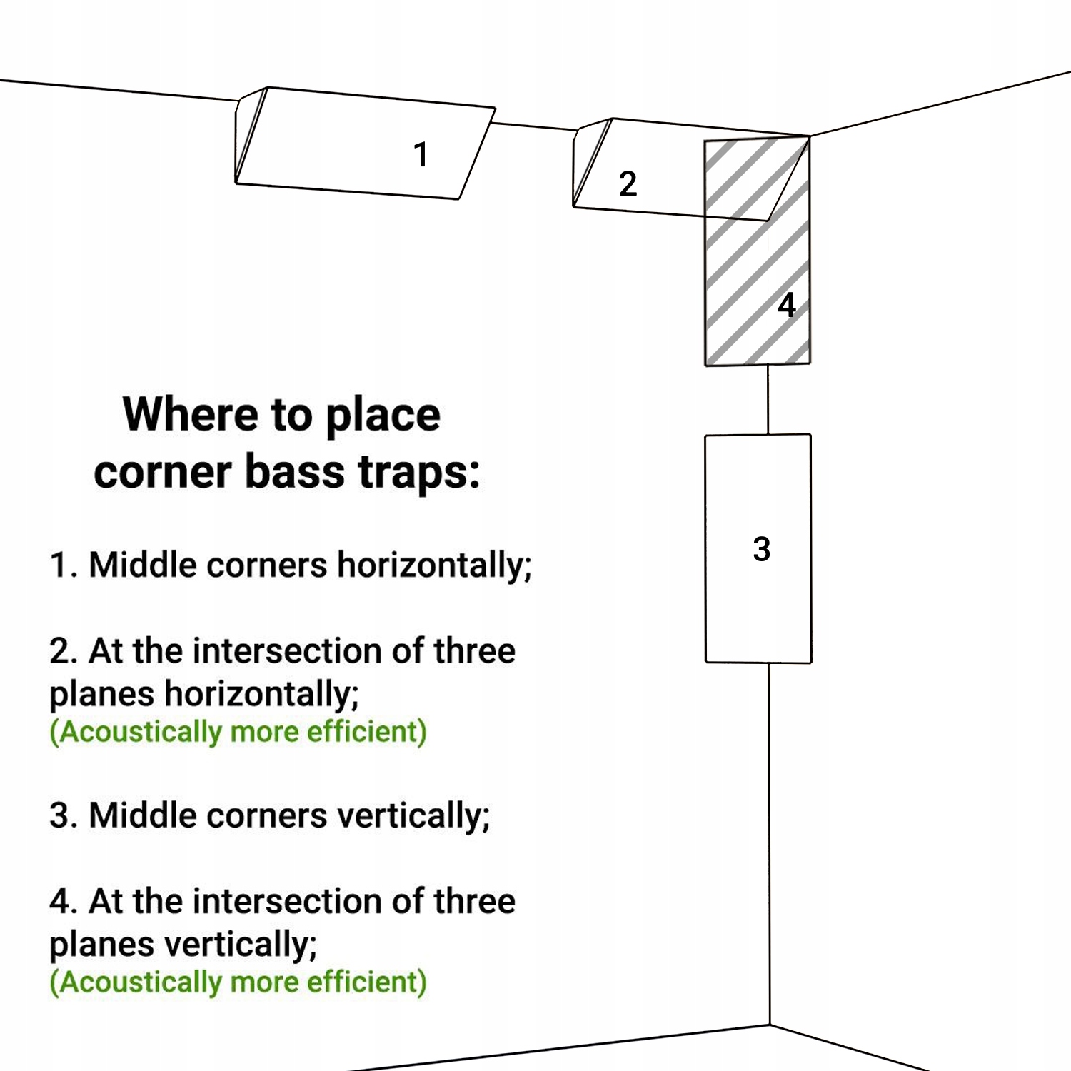 ПРИЗНАЧЕННЯ:поглинає низькі, високі та середні частоти, ударну луну та інші дратівливі звуки. Ідеально підходить для розміщення в кутку під стелею, а також у кутах стін, якщо немає достатньо місця для великої пастки.