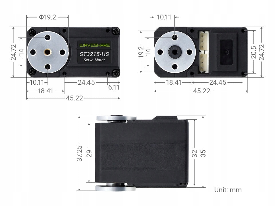 ST3215-HS Service Engine з послідовною шиною , призначеною для додатків, що потребують високого крутного моменту та точного управління кутом. У , що використовується у магнітному кодері з високою точністю, він дозволяє контролювати кут 360 ° з максимальною швидкістю до 106 об/хв . Цей двигун пропонує можливість програмування будь -якого кута як положення середньої служби та перемикання між робочим режимом як безперервний двигун (з управлінням швидкістю у закритому циклі) та режимом крокового двигуна.