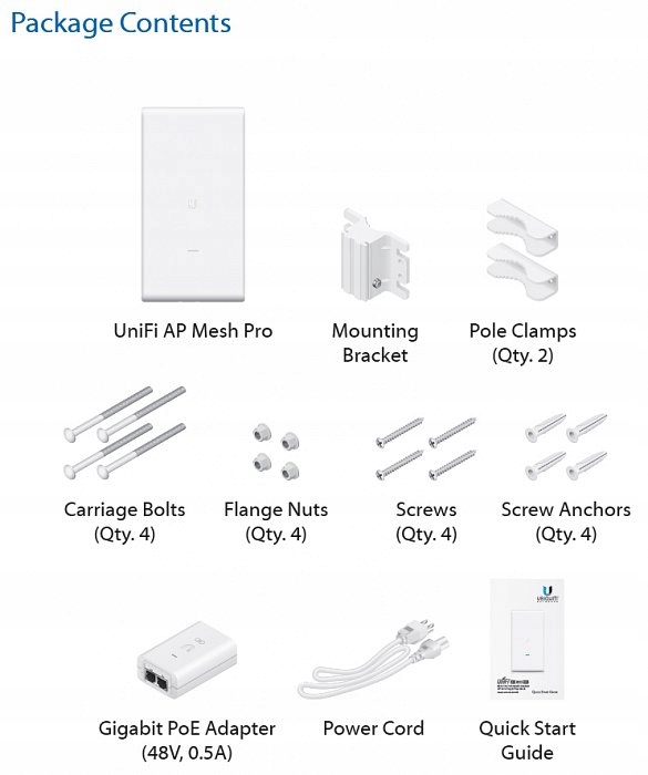 ▶️ UniFi AC Mesh Pro AP можна встановити на стіну, щоглу або кронштейни для швидкого монтажу. (Усі аксесуари включені.) Ви можете живити точку доступу UniFi AC Mesh Pro за допомогою сумісного комутатора UniFi PoE 802.3af або адаптера Gigabit PoE, який входить у комплект. Ми рекомендуємо живити пристрої UniFi через комутатор UniFi PoE (продається окремо).