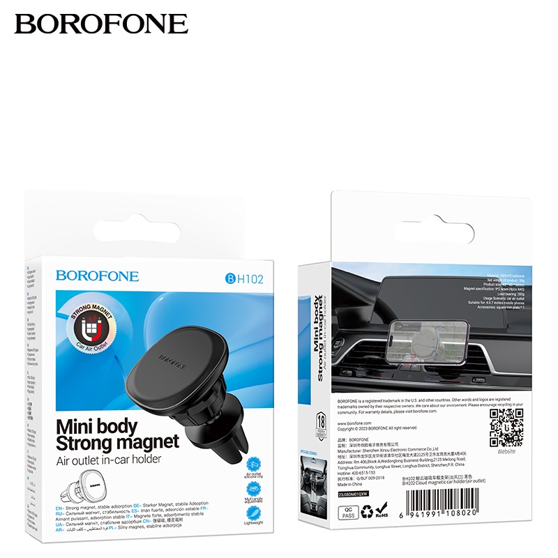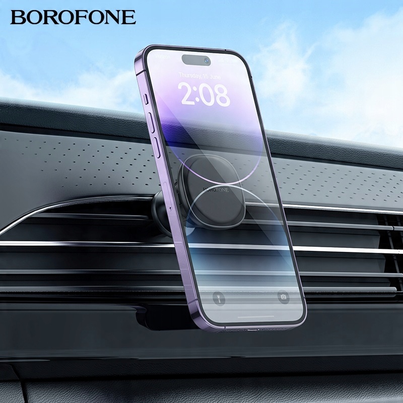 BOROFONE 102 Cloud це магнітний телефон/тримач для телефону, який підвищує безпеку водіння телефон, кріпиться до вентиляційної решітки автомобіля за допомогою затискача, оснащеного кульовим шарніром, що дозволяє монтувати пристрій під кутом 90 градусів з поворотом на 360 градусів для ще кращої адаптації до потреб водія.