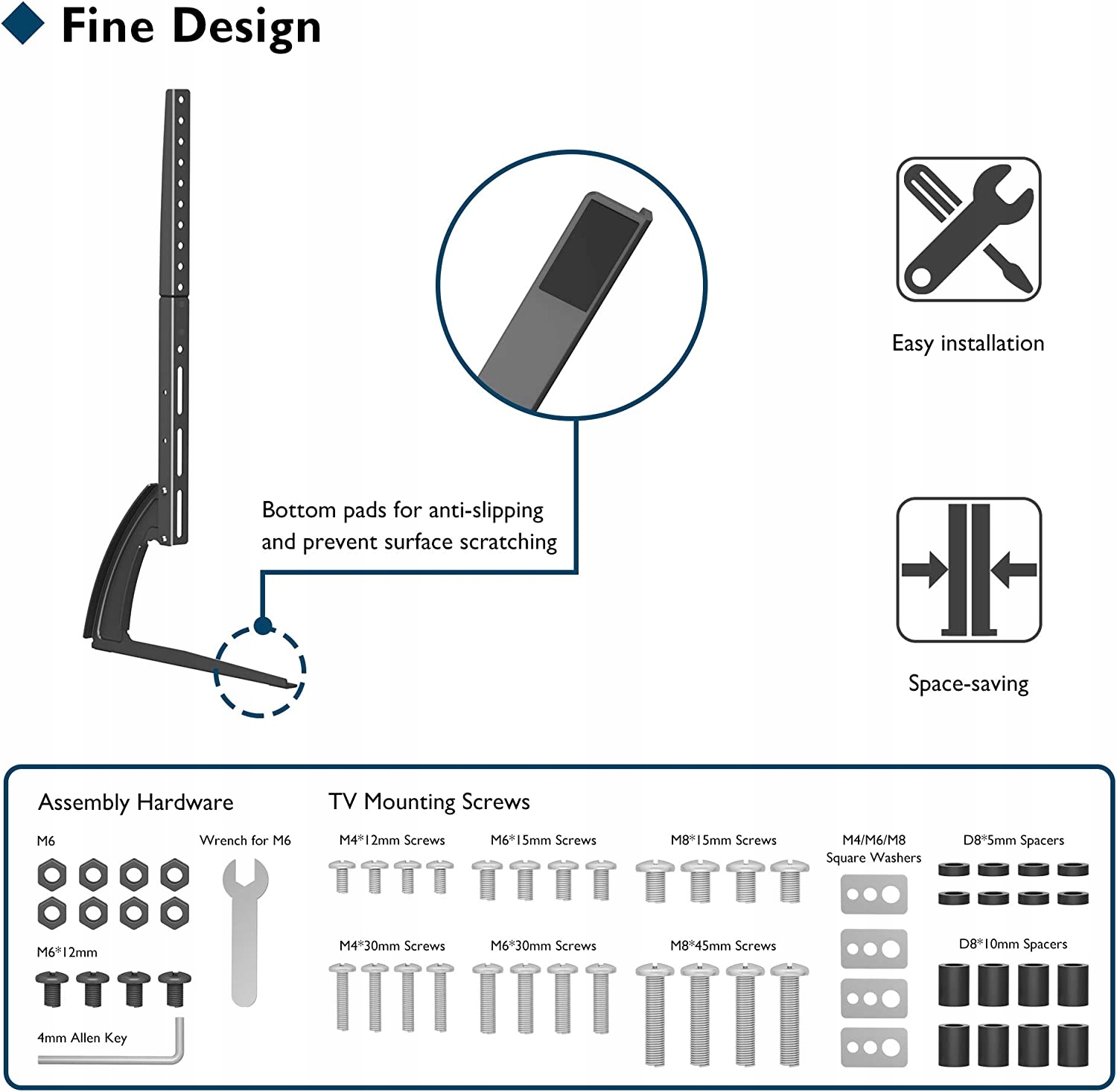 НИЗЬКОПРОФІЛЬНИЙ КОНСТРУКЦІЙ ТА ЕКОНОМІЯ ПРОСТОРУ: простір між двома ніжками дозволяє ідеально розмістити аудіообладнання чи аксесуари; міцна сталева конструкція з двоножною системою забезпечує високу стабільність і довговічність; нижні накладки запобігають подряпинам на поверхні