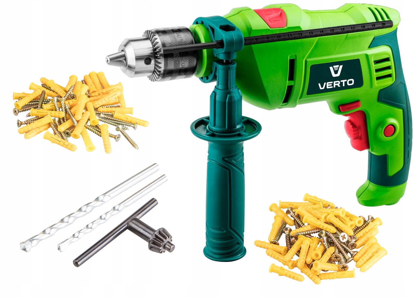 Ударна дриль на 600 Вт (код 50G509) із самозатискним патроном 13 мм, що дозволяє швидко встановити дриль. Має функції свердління та ударного свердління. Потужність 600 Вт дозволяє свердлити отвори діаметром до 20 мм в дереві, 13 мм в бетоні і 10 мм в сталі. Дриль має перемикач повороту вправо/вліво, можливість плавного регулювання обертів і блокування безперервної роботи. Він оснащений довгим з'єднувальним кабелем, що забезпечує вільну роботу інструменту. Ергономічна ручка підвищує комфорт і безпеку роботи. Поставляється з додатковою боковою ручкою та обмежувачем глибини свердління. Відповідність європейським стандартам безпеки забезпечується сертифікатом CE. Бренд VERTO пропонує асортимент електроінструментів і аксесуарів для кожного ентузіаста DIY.