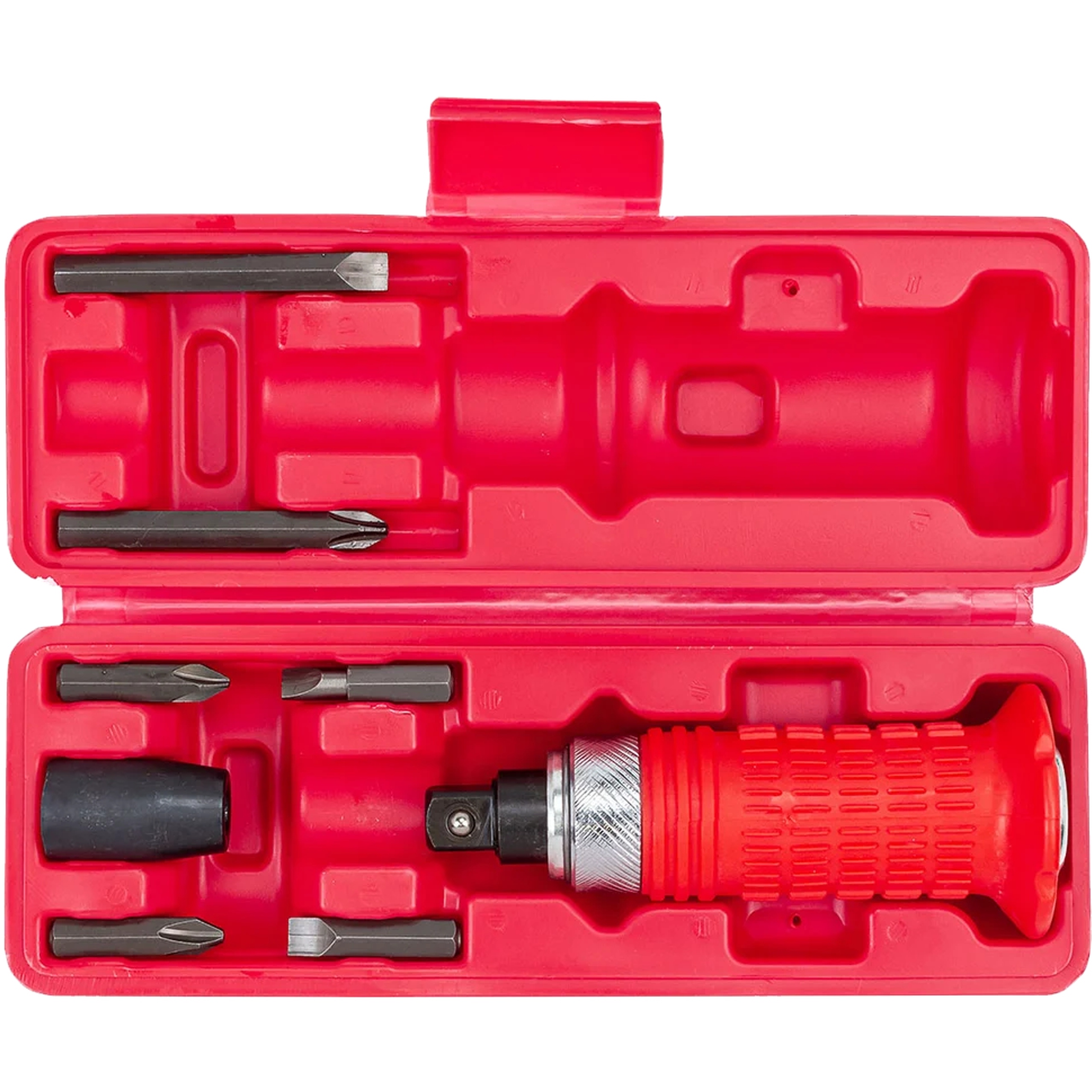 У набір входить ударна викрутка, адаптер 1/2''(F) x 5/16''(F), шість змінних наконечників і захисна ручка TPR, що підвищує комфорт і безпеку роботи. Все упаковано в практичну, міцну валізу з відділеннями, що полегшує зберігання та транспортування.