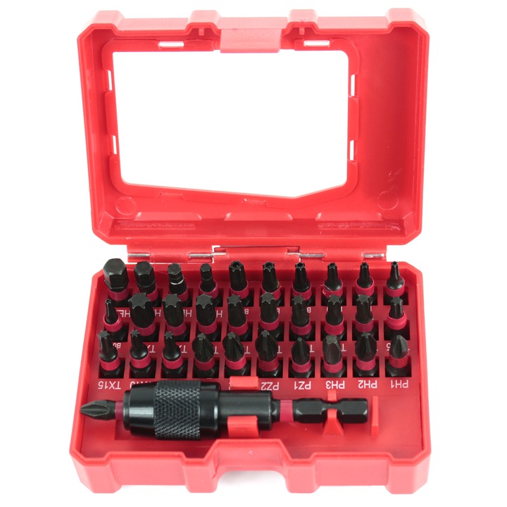 Спеціальна конструкція насадок мінімізує навантаження на кінчик насадки, роблячи її більш стійкою до поломок. Спеціальна термічна обробка поглинає удари - завдяки їй насадка згинається як пружина. Кована та пресована головка насадки забезпечує найкраще прилягання до головки гвинта, не пропускаючи та не знімаючи її, що подовжує її довговічність. Швидкозмінний магнітний тримач, що входить до комплекту, значно полегшує роботу та заміну насадок.