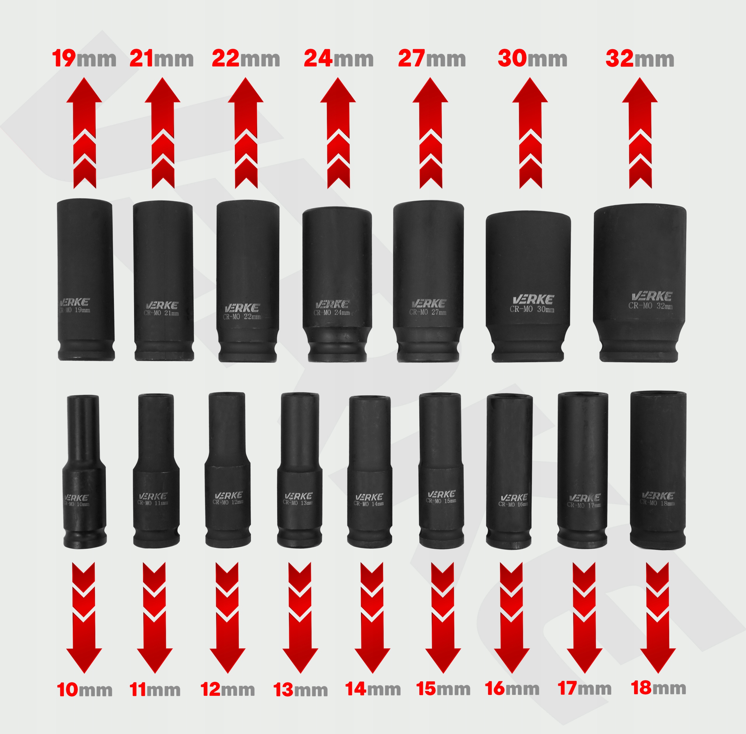 - Містить шестикутні короткі та довгі ударні гнізда популярних розмірів від 10 до 32 мм.