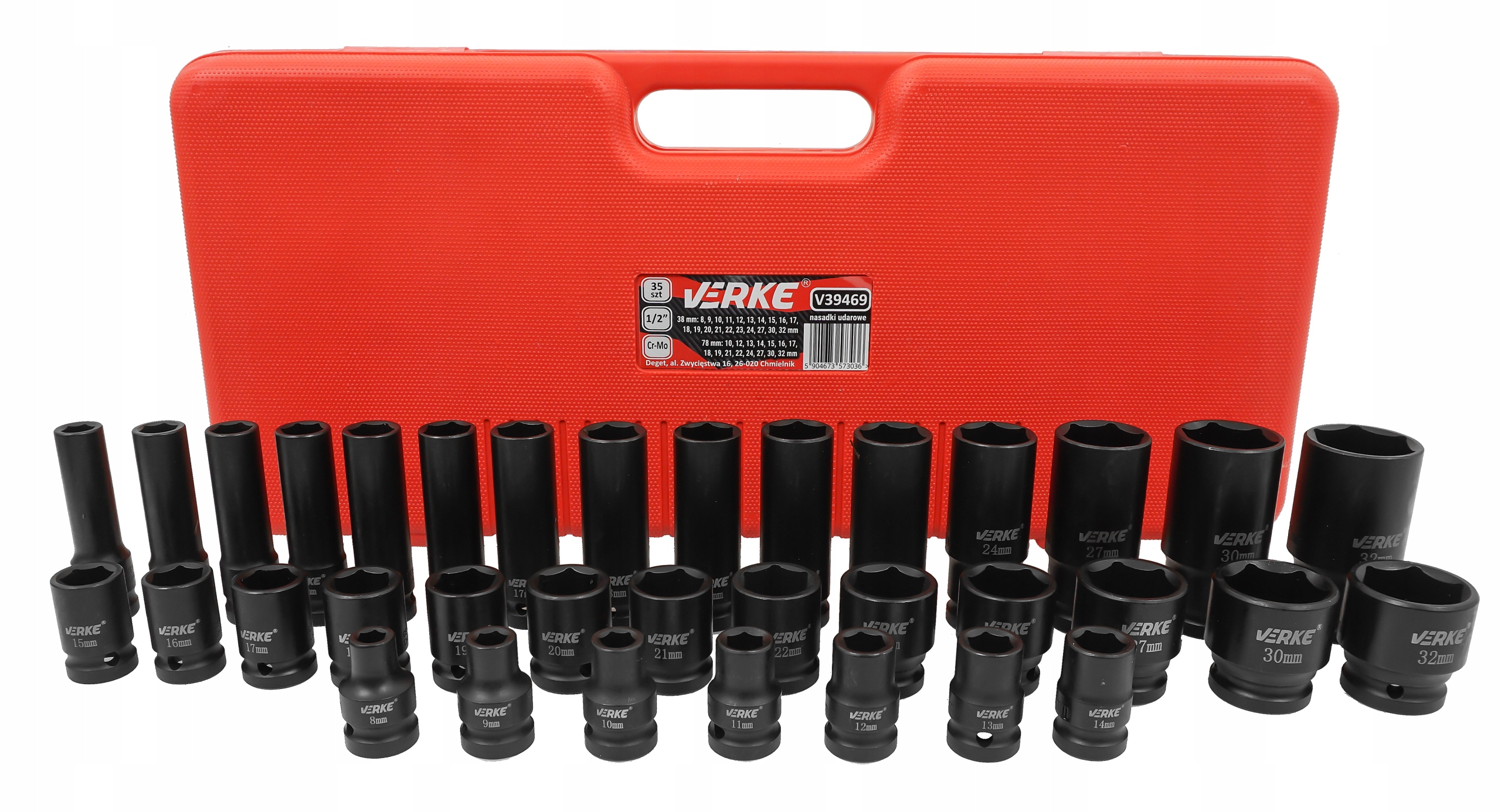 - Містить короткі та довгі шестикутні ударні головки популярних розмірів від 8 до 32 мм.