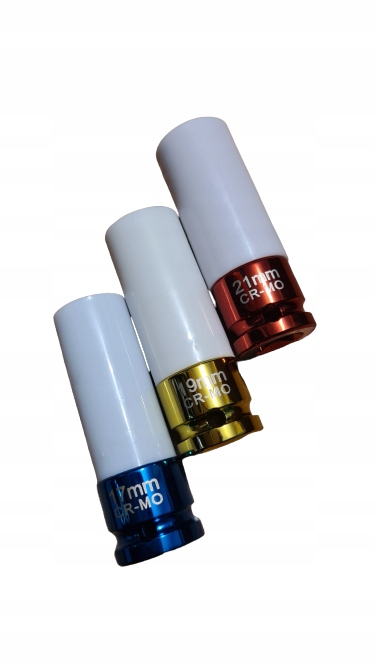 Набір із 3 ударних гнізд для алюмінієвих дисків виготовлено з дуже міцної хромомолібденової сталі. Всередині ковпака знаходиться пластикова втулка, завдання якої захистити обід від пошкоджень. У комплекті 3 розетки розміром 17, 19, 21 мм. Завдяки хромованому покриттю в 3 різних кольорах вибір і розрізнення буде набагато простіше. Все упаковано в маленьку функціональну валізу.
