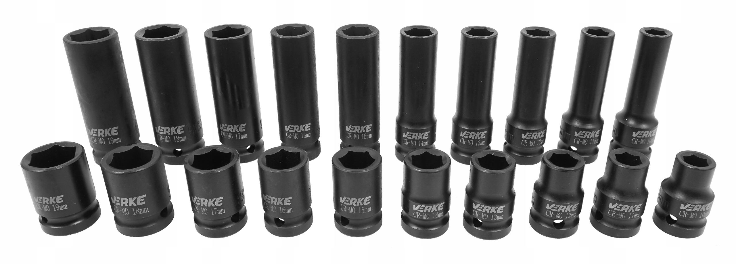 ГОЛОВКИ УДАРНІ КОРОТКІ ТА ДОВГІ 1/2" 20 ШТ. 10-19мм VERKE