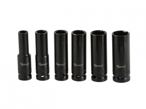 Набір професійних довгих ударних головок від відомого бренду GEKO. У набір входить шість ударних головок розміром 10-21 мм. Розетки виготовлені з високоякісної хром-ванадієвої сталі (CRV), що характеризується підвищеною стійкістю до механічних пошкоджень. Пристосований для роботи з ударним гайковим ключем 1/2"
