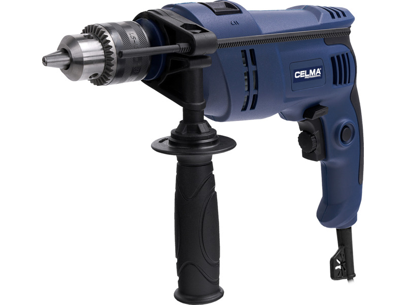 Ударна дриль CELMA PROFESSIONAL. Одношвидкісний пристрій, призначений для свердління отворів з обертальним рухом шпинделя - в металі, дереві та пластмасах - і з обертально-ударним рухом шпинделя в будівельних матеріалах. Інструмент також можна використовувати для закручування та видалення гвинтів і болтів діаметром не більше 6 мм.